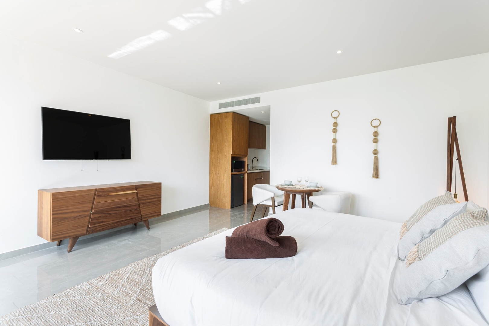 The dining area features a modern table for two, and the smart TV is perfect for relaxing nights with your favorite shows. Large floor-to-ceiling windows fill the space with natural light and connect you to the beauty of the tropical surroundings.
