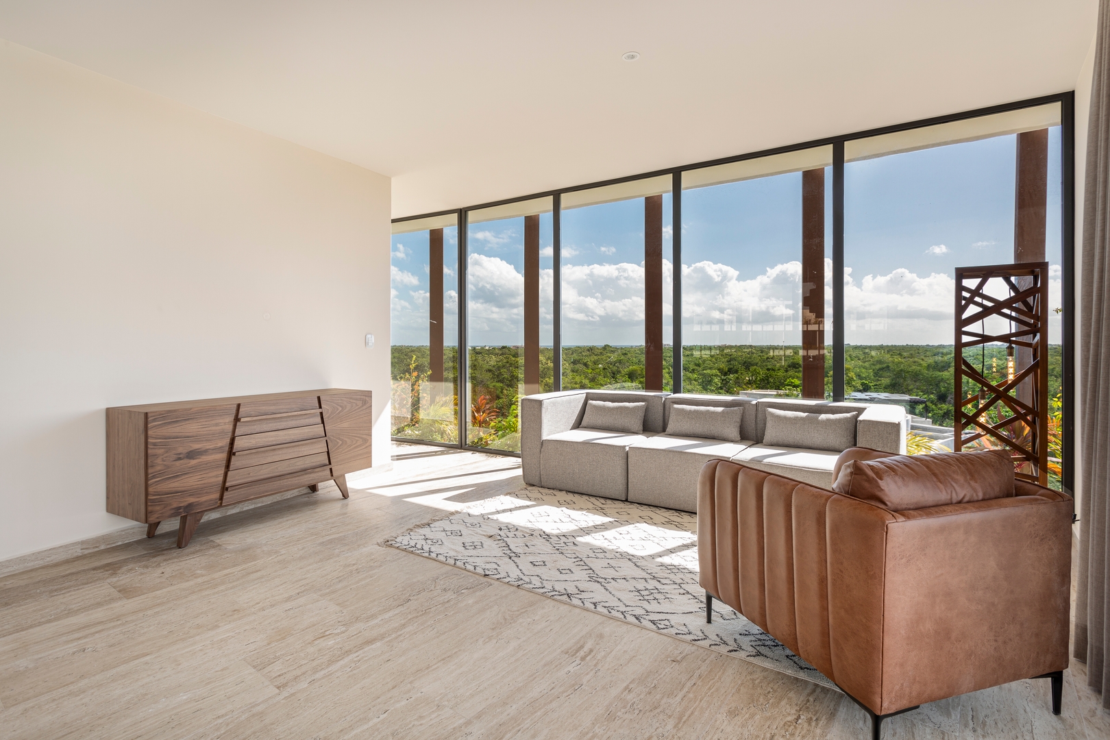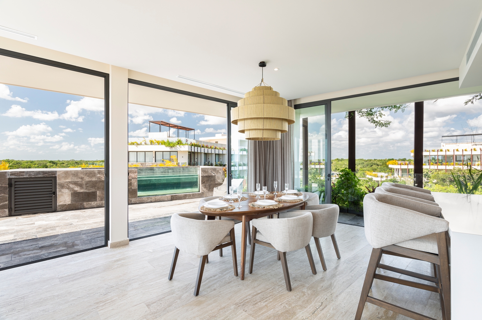 Floor-to-ceiling windows flood the space with natural light and offer sweeping views of both the lush jungle and the beautifully landscaped interior garden, creating a true indoor-outdoor living experience.