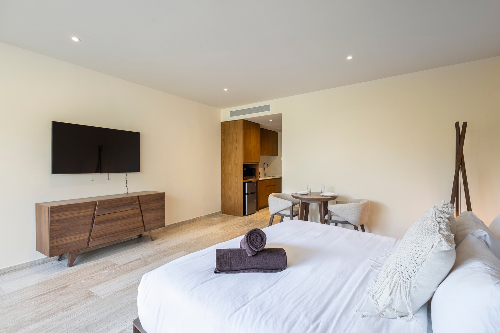 Gorgeous interiors by day, premium comfort by night. This beautifully designed studio is fully furnished and perfect for a relaxing Tulum getaway. It features a compact but fully equipped kitchen, a cozy dining area, a plush king-size bed, a sleek bathroom stocked with towels, shampoo and conditioner, plus a private balcony ideal for morning coffee or evening relaxation.