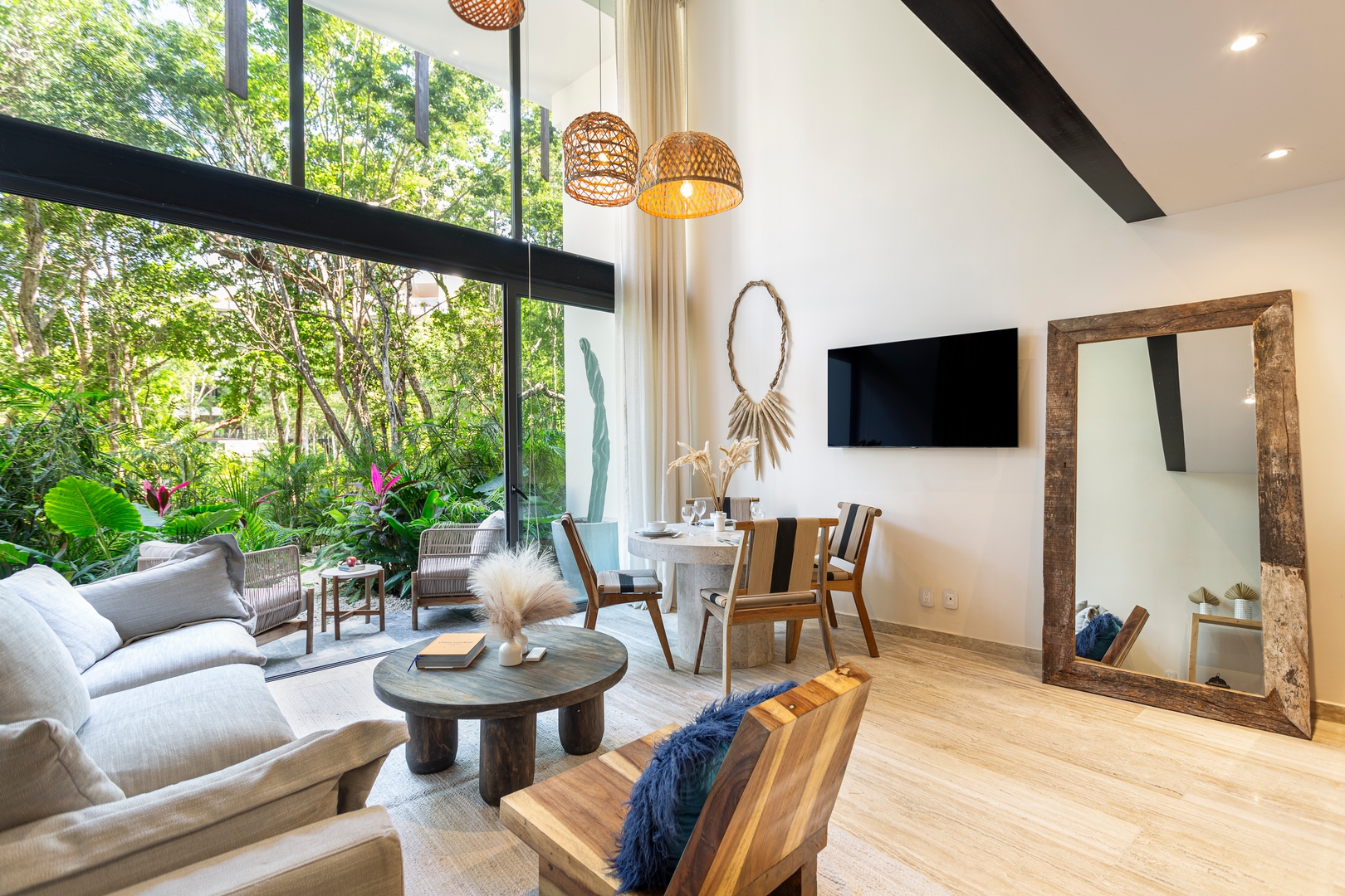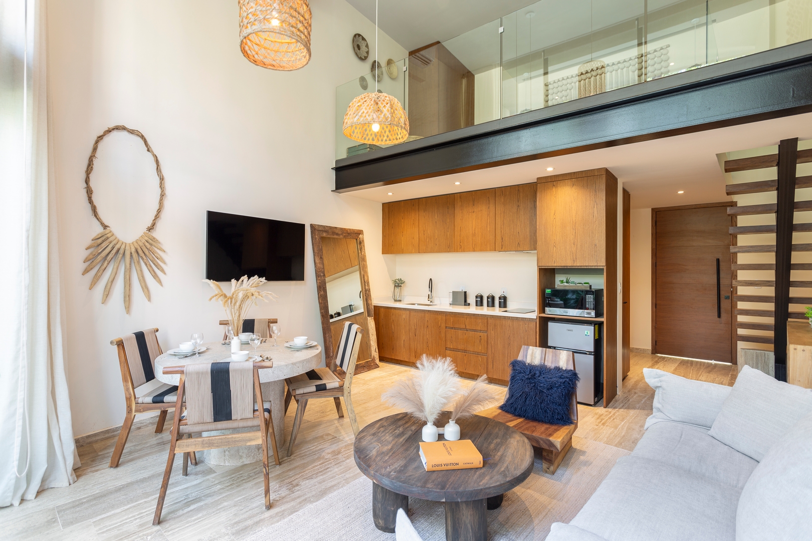 The spacious loft faces the tranquil Tulum jungle and the sparkling pools, providing a peaceful retreat with plenty of privacy. Guests can easily access both stairs and the elevator to reach the rooftop pools, where breathtaking panoramic views await.